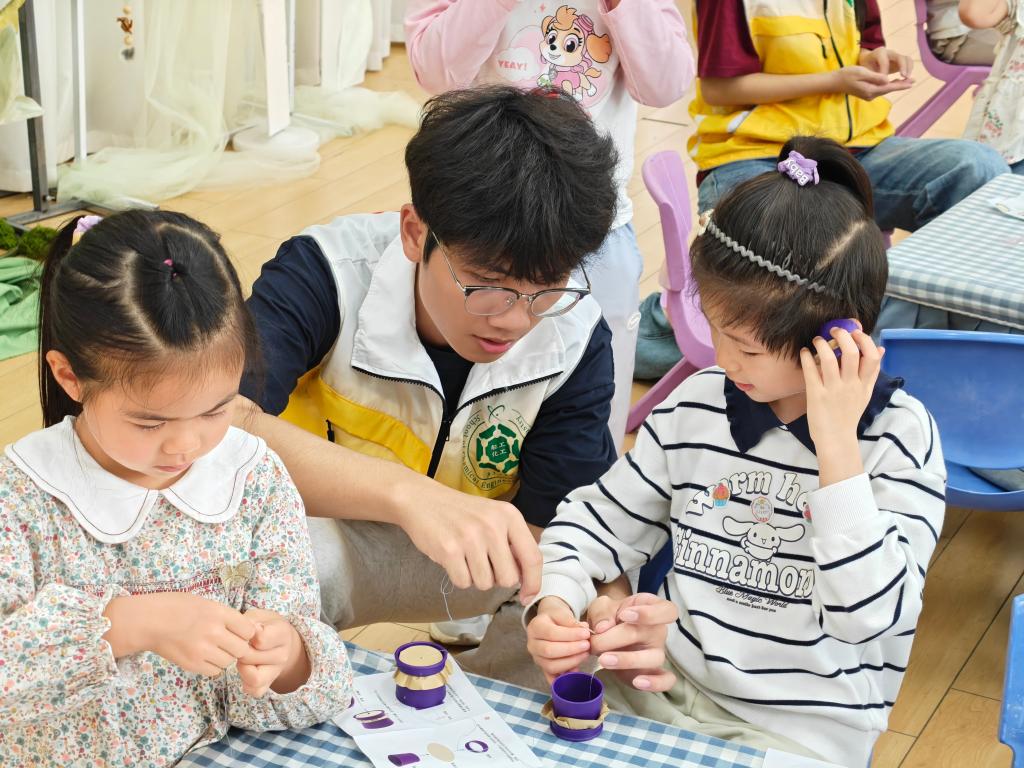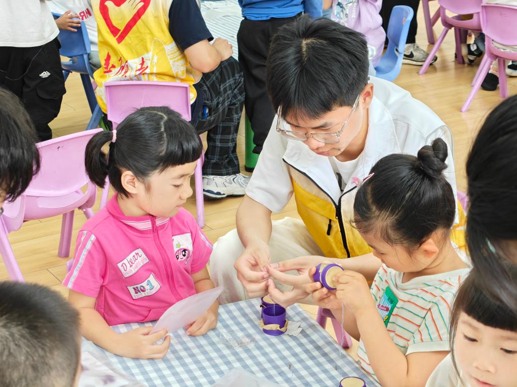 课程后半段,小朋友们亲手组装土电话,沉浸式体验“固体传声”的奥秘。12名志愿者化身专业科学助手,全程陪伴助力实验顺利开展。他们耐心指导小朋友粘贴牛皮纸,反复提醒大家用牙签穿孔时注意避免扎手,在细致的引导与贴心的叮嘱下,每位小朋友都成功通过自制土电话听到了同伴的声音。一声声欢呼,是实践探索后的由衷喜悦,是对科学魅力的真切赞叹,更是对这堂科普课最真挚的褒奖。